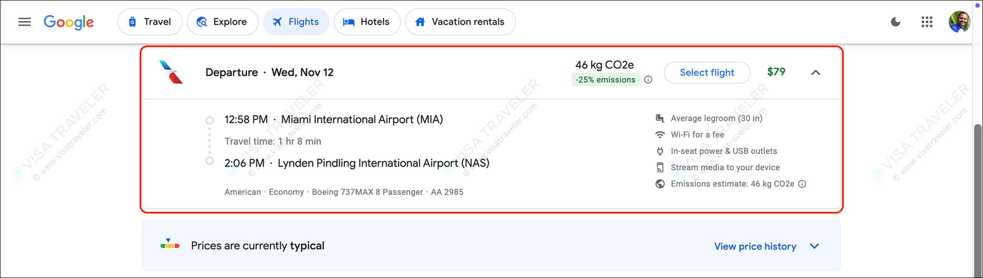 Above is an example of a one-way flight to Nassau, the Bahamas, from Miami International Airport. As you can see, it’s a direct flight and the fare is SUPER CHEAP.