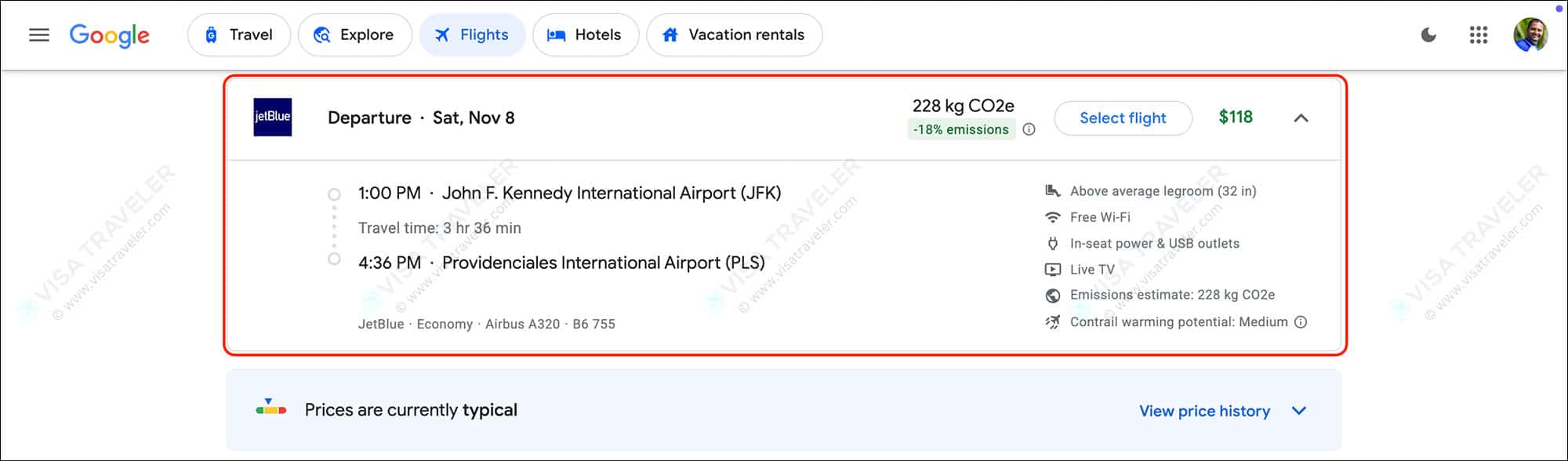 Above is an example of a one-way flight to Providenciales, Turks and Caicos from JFK International Airport. As you can see, it’s a direct flight and the fare is QUITE CHEAP.